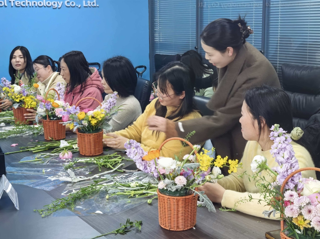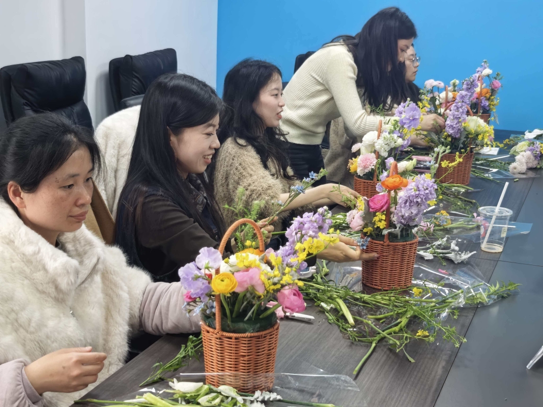 活动现场花香四溢,公司女职工齐聚一堂,氛围温馨愉悦,在花艺老师的指导下沉浸式投入创作,巧手修剪搭配,将普通花材打造成造型别致的花篮。